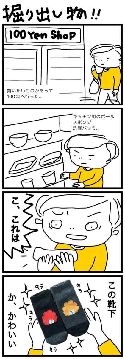 2023-01-18 掘り出し物 ゆるい日常 100均に行った。 一応買いたいものがあったのでそれらをどんどんカゴに入れていく。 最近は100均にも良いものがいっぱいあるので吟味に吟味を重ねていく。 そんな中、私の目を釘付けにしたものがこの靴下。 「何これ!すっごいかわいい〜‼︎」と心で叫んだ。 靴下別に欲しくなかったけど色違いで二枚買ってしまった。 よし!これはアフロな気分の時に履くぞ! アフロな気分