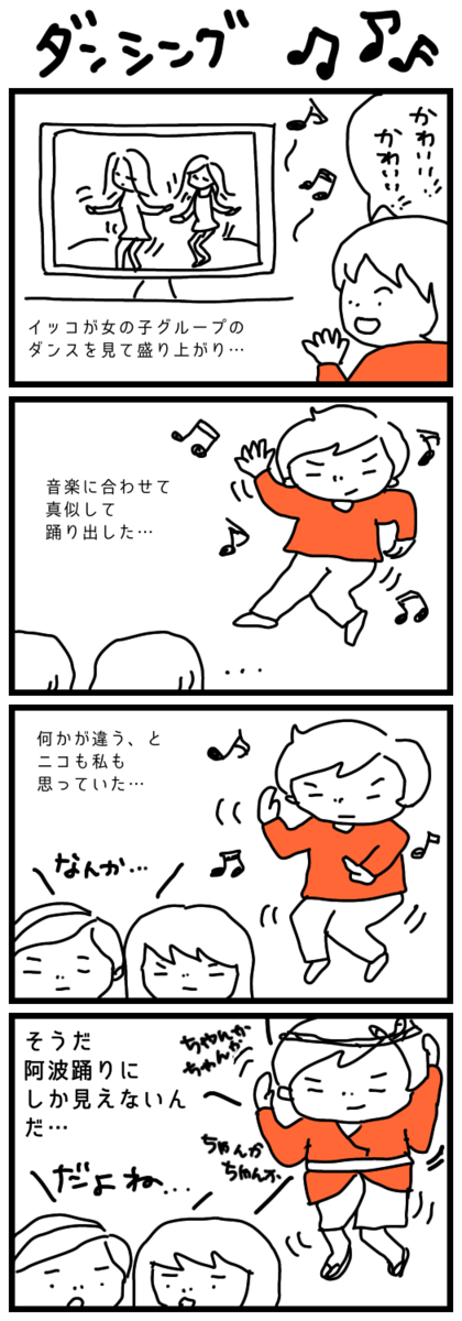 2023-01-27 ダンシング イッコニコサンコ 私の絵と文章力が無さ過ぎて上手く伝わらないかもしれませんが イッコが踊ると本当に「ちゃんかちゃんか、ちゃんかちゃんか♫」と 聞こえてきそうなんです。 本人はすごく踊れてる感満載でドヤ顔してくるので ここはそっと見守ることにします。