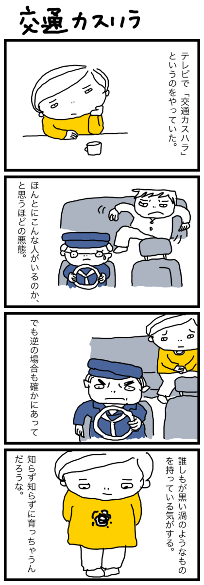 2023-04-06 交通カスハラ ゆるい日常 「交通カスハラ」初めて聞いた。 ハラスメントの類だけれど、こんな事、ほんとに?な事例がある。 人間は黒い渦のようなものがふつふつとあって それがいろんな生活環境、縁などに触れ見え隠れするような気がする。 私にももちろんあって、悪い心となって行動や言葉に現れる。 遮るものがなければ気付かず大きくなっていく。 どうすればいいのか?ちょっとした心の余裕だろうか。 と、テレビを観ながら思う朝であった。 ランキング参加中主婦 ランキング参加中【公式】ミニブログ