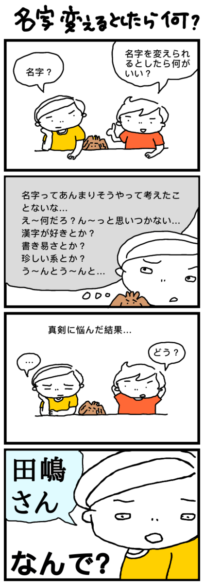 2023-07-26 名字を変えるとしたら何がいい? ゆるい日常 全く考えたことが無かった。 結婚前は結婚への夢みたいなもんでちょっと好きな人の名字に 変わる事を想像したりはあったかもしれないが 今はもう名字が変わるとかは現実的な事になるので。 なので即答できず考えすぎてたどり着いた答えが 「田嶋さん」。 周りに田嶋さんはいないし、どうしてなのかわからない。 だけど田嶋さんと言ってしまった。 ちなみにサンコは推しの名字で即答だったらしい。 乙女の夢があるのっていいな〜と思ったのでした。 ランキング参加中主婦