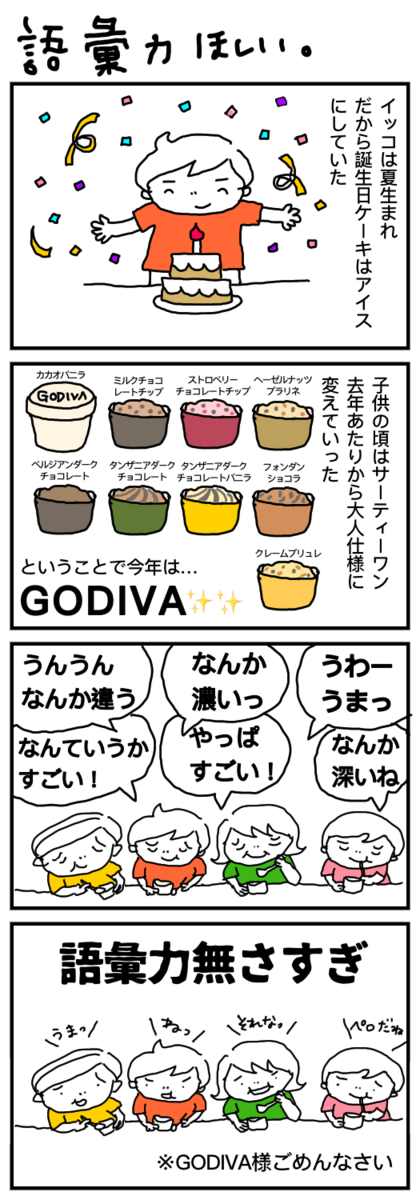 2023-08-26 語彙力が欲しい 今年のイッコの誕生日ケーキはGODIVAのアイスにしました。 定番の9種類を奮発して買い込み、皆んなでシェアして あーだこーだ言いながら堪能しました。 物凄く美味しかったのですが、それを上手く表現する語彙力の無さ。 もう少し気の利いた表現ができたら良いのですが まあとにかくおいち〜のでした。 チョコ好きの方は是非〜🍫🍨 ランキング参加中主婦
