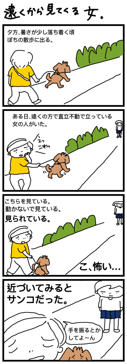 2023-08-31 遠くから見てくる女 イッコニコサンコ 本当にこわかった。 娘にこう言うのも何だけど、不気味な雰囲気を醸し出していた。 せめて手を振るとか動いてくれていたらよかったのに。 まあ私の目も悪いんだけども。 ランキング参加中主婦