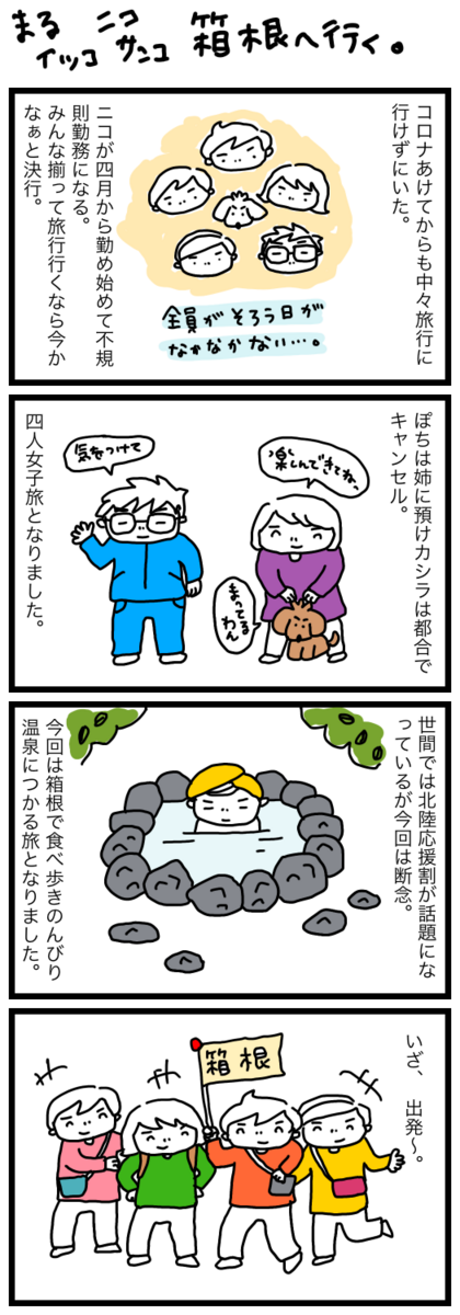 2024-03-18 まる、イッコ、ニコ、サンコ、箱根に行く。 いったとこ という事で箱根に行って参りました。 本当はこのタイミングでちょっと遠出したいなぁと思っていましたが 中々皆の都合が合わず、色々探した結果、のんびり箱根旅となりました。 カシラは都合で残念ながらキャンセル。またいつか夫婦で呑み旅でも計画しよう。 今回は女子旅という事でまずは食べ歩きからスタート。 明日から少しずつお伝えしようと思います。 あ〜、楽しかった〜。 ランキング参加中主婦 ランキング参加中コミックエッセイ ランキング参加中絵日記